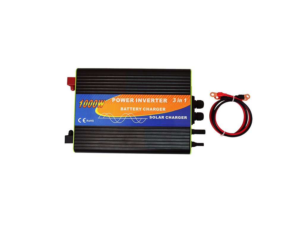 Měnič napětí značky KOSUN 1000W, 12V (DC) s čistou sinusoidou, má integrovanou nabíječku (nabíjecí proud až 30A), USB výstup (s napětím 5V, proudem 2.1A) pro nabíjení různých zařízení a MPPT solární regulátor pro připojení solárních panelů ( max. napětí 70V). Přístroj disponuje také funkcí UPS (automatické přepínání sítě a baterie při výpadku napájení) a ECO (pro úsporu energie, prioritní zdroj energie solární panel anebo baterie).