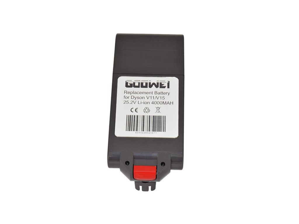 Goowei Baterie pro Dyson V11, V15 - 25.2V 4000mAh je výměnný akupack pro vysavače Dyson V11 a V15. Výkonná lithiová baterie s novými vysoce kvalitními články 100% kompatibilní s originální baterií. Baterie má shodné rozměry a funguje jako originální baterie včetně použití původní nabíječky.