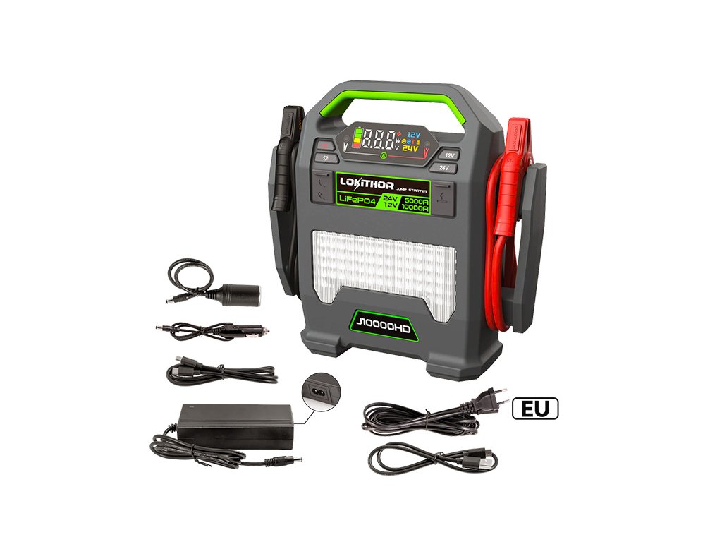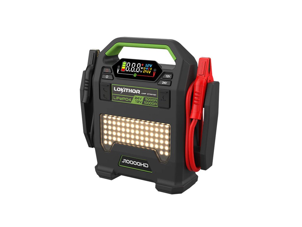 Lokithor J10000HD je nejvyšší model z Heavy Duty řady výrobce Lokithor a představuje skutečně robustní startovací zdroj navržený pro nepřetržitý profesionální provoz. Díky podpoře 12V i 24V startování dokáže jediný přístroj obsloužit smíšené vozové parky bez nutnosti více zařízení. Přepínání napětí probíhá stlačením příslušeného tlačítka po dobu 2s s následnou signalizací na displeji.
