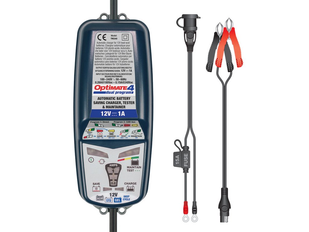Doporučené pro baterie kapacity od 2 do 50Ah. Nepoužívat pro nabíjení akumulátorů NiCd, NiMH, Li-ion nebo primární články. Vstup: 220-240V AC/ 0,085A. Výstup: 0,8A 12W. Nabíjení a diagnostika - AUTOMATICKÉ MIKROPROCESOREM ŘÍZENÉ. Doporučuje 8 hlavních výrobců motocyklů. Výhodou OptiMATE 4 Dual Program je možnost nabíjení (při zakoupení zástrčky) také přes cigaretový zapalovač i u motocyklů moderních motocyklů, u kterých je nutné obejít elektronickou sběrnici CAN BUS, která nepovolí nabíjení bez zapnutého klíčku v zapalování.