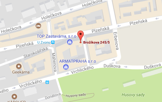 Naši prodejnu (kamenný obchod) naleznete na Praze 5, ulice Brožíkova, č. 5. Sídlíme nedaleko od nákupního centra Smíchov, asi 100 metrů od tramvajové zastávky U Zvonu (linky č. 9, 10, 15 a 16). V objektu společnosti je parkoviště pro zákazníky.