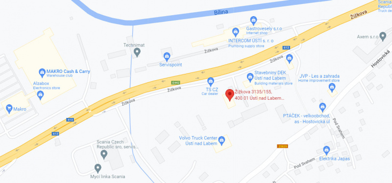 Naši prodejnu naleznete v Ústí nad Labem, v ulici Žižkova 3135/155. Ze silnice 613/E442 odbočte směrem na ulici Žižkova. Nedaleko od naší prodejny se nachází stavebniny DEK.