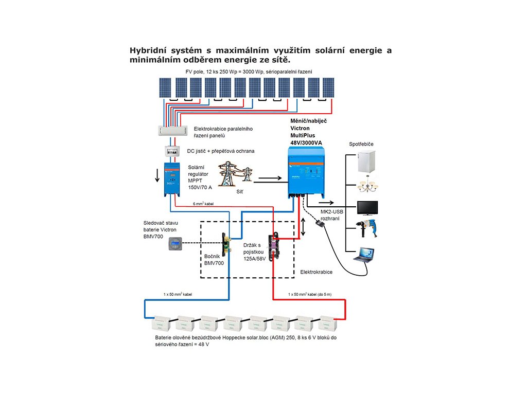 Příklad z mnoha možných zapojení viz. přiložené obrázkové schéma - Fotovoltaické panely vyrábí energii, která je pomocí solárního regulátoru ukládána do baterie stejnosměrný DC proud). Měnič/nabíječ MultiPlus odebírá energii z baterie, přeměňuje ji na střídavý AC proud pro napájení 230 V spotřebičů (funkce měniče). V případě nedostatku energie v baterii (málo solární energie) nebo v případě přetížení měniče (příliš velký odběr energie spotřebiči) odebírá MultiPlus energii ze sítě. K odpojení sítě dojde při dobití baterie na určitou přednastavenou úroveň nebo při odeznění přetížení. Funkci nabíjení baterie lze zcela zakázat. K dodávkám vyrobené energie do sítě nedochází. Je možno realizovat i třífázové systémy.